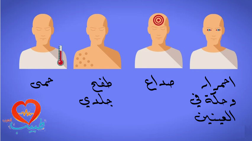 وأعراض المرض خفيفة عموماً وهي تشمل الإصابة بالحمى والطفح الجلدي والتهاب الملتحمة وآلام.